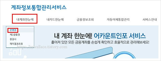 내 은행계좌 조회 홈페이지 내 계좌 한눈에 서비스 이용은 계좌정보통합관리서비스 홈페이지를 통해 가능합니다. 내 계좌 한눈에 서비스는 다음이나 네이버 구글 등의 검색을 통해 쉽게 찾아 볼 수 있습니다.