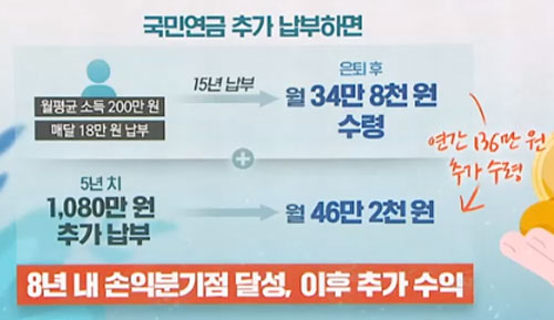 그런데 추가로 5년 치 보험료 1,080만 원을 더 납부하게 되면 월 수령액이 46만 1,910원으로 늘어난다고 합니다. 이럴 경우 매년 136만 원이 늘어나는 결과가 나오기 때문에 8년이면 원금 모두를 돌려받게 되는 셈이고 그 이후로는 매년 540만 원의 추가 이득이 생긴다고 합니다.