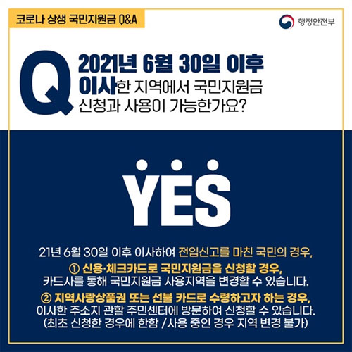 만약 이전 주소지에서 이미 해당 지자체의 지역사랑상품권 또는 선불카드를 지급받아 사용 중인 경우라면 5차 재난지원금 사용지역 변경이 불가능하다고 합니다.