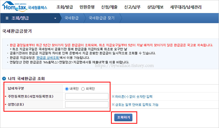 나의 국세환급금 조회 항목에서 내국인 외국인 구분 및 이름과 주민등록번호를 넣고 조회하기를 클릭합니다. 아주 간단하게 국세 환급금 조회방법이 완료됩니다.