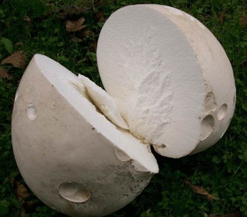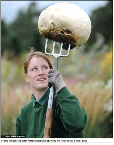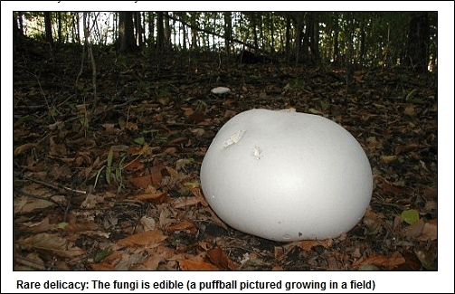 요.. 댕구알버섯은 스태포드셔의 한 농장에서 일하는 농부 테리 허드슨 워커가 발견한 건데요. 폭이 45cm에 달하는 댕구알버섯이라고 합니다. 속살이 하얀 것은 식용으로 사용할 수 있으며 자이언트 풋볼(Giant puffball) 또는 'Calvatia gigantea(학명)'로 불린다고 합니다.