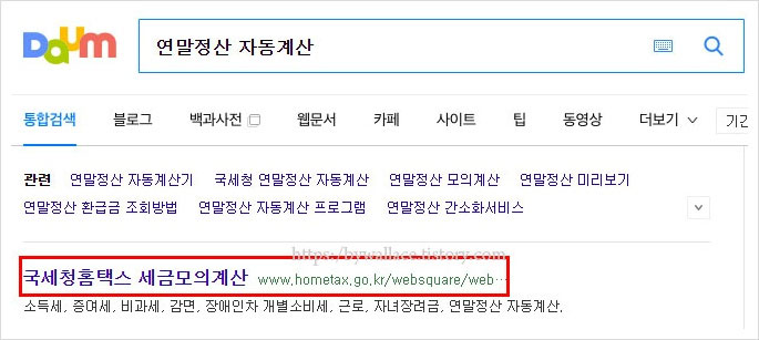 다음이나 네이버 구글 등 검색창에 연말정산 자동계산을 검색하면 국세청홈택스 세금모의계산 홈페이지 바로가기가 나옵니다. 클릭해 주세요.