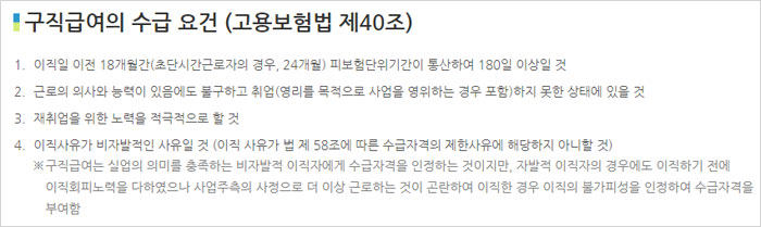 구직급여의 수급 요건 (고용보험법 제40조)에 따른 실업급여 수급자격 조건을 살펴보면 다음과 같다고 합니다.