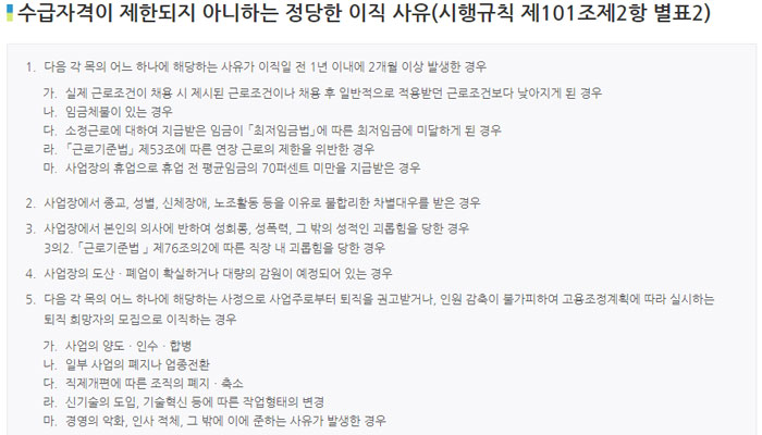 ▣ 실업급여 수급자격 조건 중 수급자격이 제한되지 아니하는 정당한 이직 사유는(시행규칙 제101조제2항 별표2) 다음과 같다고 합니다.