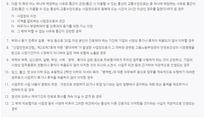 6. 다음 각 목의 어느 하나에 해당하는 사유로 통근이 곤란(통근 시 이용할 수 있는 통상의 교통수단으로는 중 하나에 해당하는 사유로 통근이 곤란(통근 시 이용할 수 있는 통상의 교통수단으로는 사업장으로의 왕복에 드는 시간이 3시간 이상인 경우를 말한다)하게 된 경우.