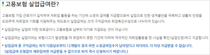 하지만 실업급여 중 구직급여는 퇴직 다음날로부터 12개월이 경과 하면 소정급여일수가 남아있다고 하더라도 더 이상 지급받을 수 없다고 합니다. 실업급여 신청없이 재취업하면 실업급여를 지급받을 수 없기 때문에 퇴직 즉시 신청해야 한답니다.