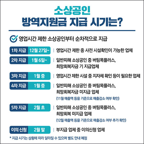 100만원 소상공인 방역지원금 지급시기는 지난 12월 27일부터 영업시간 제한을 받았던 소상공인부터 방역지원금 지급이 시작되었다고 합니다.