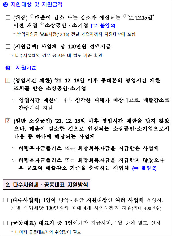 ② 일반 소상공인은 버팀목자금플러스 또는 희망회복자금을 지원받은 소상공인은 매출이 감소한 것으로 인정된다고 합니다. 그 외의 경우, 코로나19 확산 이전 기간 대비 방역조치가 강화된 2021년 11월 또는 12월의 매출감소 여부를 판단 해 소상공인 방역지원금이 지급된다고 합니다.
