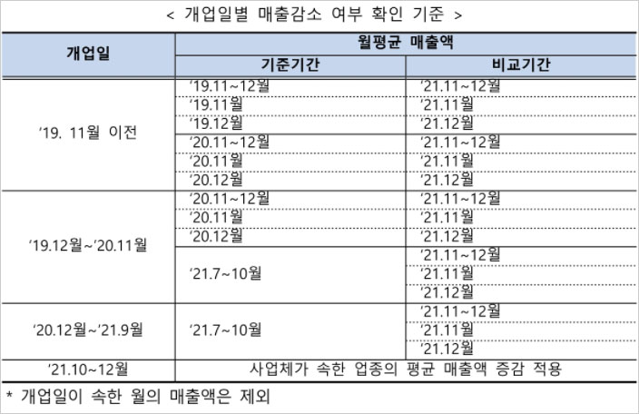 이외에도 코로나19 확산 이전 기간 대비 방역조치가 강화된 2021년 11월 또는 12월의 매출감소 여부를 판단해 지원금 지급이 결정된다고 합니다. 매출감소 여부는 2019년 또는 2020년 동기 대비 2021년 11월, 12월, 또는 11~12월 월평균 매출을 비교한다고 합니다.