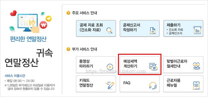 주요서비스 안내 및 부가서비스 안내가 보입니다. 부가서비스 안내에 예상세액 계산하기가 있습니다. 예상세액 계산하기를 클릭합니다. 물론 인증을 해야 이용을 할 수 있는 항목입니다.