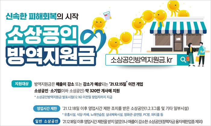 보다 자세한 소상공인 방역지원금 지원기준 및 신청절차 등 내용은 중소벤처기업부 누리집(www.mss.go.kr)의 소상공인방역지원금 공고문과 소상공인방역지원금 콜센터(1533-0100)를 통해 확인 할 수 있다고 합니다.