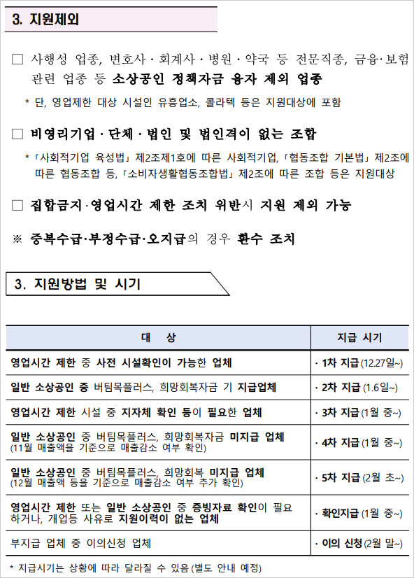 비영리기업, 단체, 법인 및 법인격이 없는 조합 또한 지원대상에서 제외되면 집합금지 및 영업시간 조치 위반시 지원 대상에서 제외된다고 합니다. 중복수급 및 부정수급, 오지급의 경우에는 환수 조치 된다고 합니다.