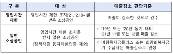 ① 2021년 12월 15일 이전 개업한 ②소상공인 및 소기업이 대상이며 지원기준은 매출이 감소하거나, 감소가 예상되는 경우 지원하게 된다고 합니다.