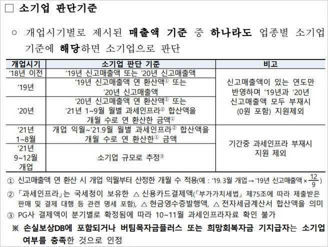 ▶개업시기별로 제시된 매출액 기준 중 하나라도 업종별 소기업 기준에 해당하면 소기업으로 판단한다고 합니다. 손실보상DB에 포함되거나 버팀목자금플러스 또는 희망회복자금 기지급자는 소기업 여부를 충족한 것으로 인정된다고 합니다.