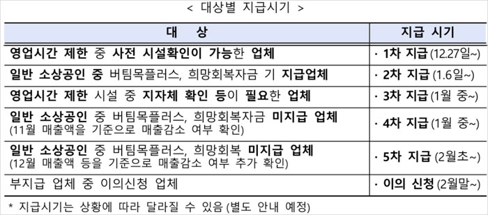 ② 영업시간 제한을 받지 않은 소상공인(여행업, 숙박업 등)은 버팀목플러스 또는 희망회복자금을 받은 적이 있는 소상공인은 내년 1월 6일에 지급을 시작할 예정이라고 합니다. 그 외에는 과세자료가 확보되는 내년 1월 중순 이후부터 매출감소 여부를 확인하여 순차적으로 소상공인 방역지원금이 지급될 예정이라고 합니다.