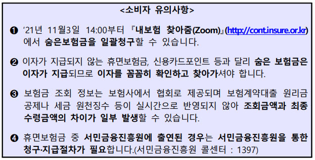 다만 추가정보 확인이 필요한 경우이거나, 10000만원 초과의 고액 보험금을 지급받아야 할 때는 보험회사가 확인전화 등을 통해 추가 정보를 확인한 후 지급한다고 합니다. 개선된 숨은 보험금 조회 및 청구 서비스는 11월 3일 오후 2시부터 내가 가입한 보험조회 사이트인 내 보험 찾아줌을 통해 이용할 수 있다고 합니다.