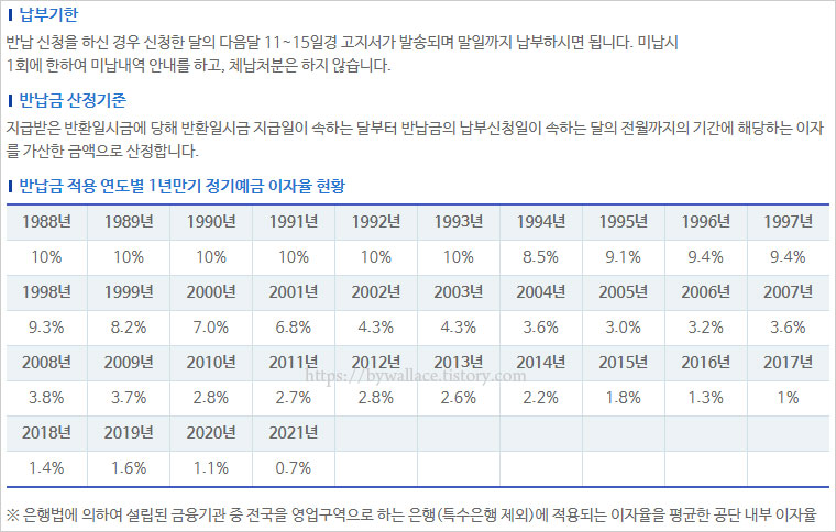 지급받은 반환일시금에 당해 반환일시금 지급일이 속하는 달부터 반납금의 납부신청일이 속하는 달의 전월까지의 기간에 해당하는 이자를 가산한 금액으로 산정한다고 합니다. 반납금 적용 연도별 1년만기 정기예금 이자율 현황은 다음과 같다고 합니다.