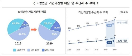 참고로 20년 이상 국민연금에 가입한 수급자는 지난해 말 기준 83만8000명이였으며 이들 평균 연금액은 월 93만원이였다고 합니다. 20년 이상 가입한 뒤 국민연금을 수령한 사람은 2015년에 32만2498명 수준이었지만 빠르게 증가하고 있다고 합니다.