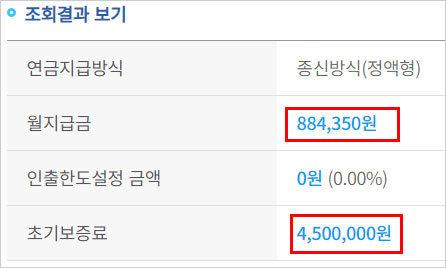 모든 조건을 같게 한 후 시세 3억 주택연금 수령액 알아보기 조회 금액은 884,350원으로 나왔습니다. 초기 보증료는 4,500,000원 입니다. 2억 아파트와 약 30만원 차이가 나는 것을 알 수 있습니다.