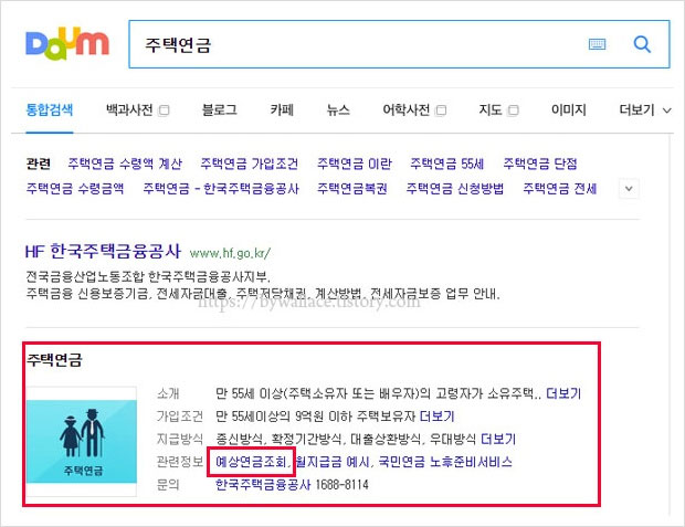 그렇다면 주택가격에 따른 주택연금 수령액은 얼마나 될까요? 주택연금 수령액 알아보기는 한국주택금융공사 홈페이지 사이트를 통해 가능합니다. 먼저 다음이나 네이버 구글 등 검색창에 주택연금을 검색하게 되면 주택연금 수령액 알아보기가 가능한 한국주택금융공사 홈페이지가 나옵니다.