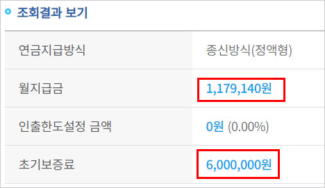 월지급금은 부부 중 나이가 적은 분을 기준으로 산정됩니다. 또한 앞에서 언급했듯이 계산 결과에서 보여지는 연금금액과 실제 월지급금 및 인출한도 금액은 가입시점 등에 따라 달라질 수 있습니다. 이점은 참고하셔야 합니다.