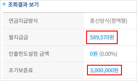 시세검색에서 2억의 일반주택, 종신지급방식, 정액형을 선택한 후 하단 조회하기를 클릭하면 2억에 대한 주택연금 수령액 조회결과를 알 수 있습니다. 초기보증료는 3,000,000원 월지급금이 589,570원으로 나왔습니다. 다만 이는 정확한 연금액은 아니기 때문에 참고로만 봐야 한다고 합니다.