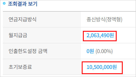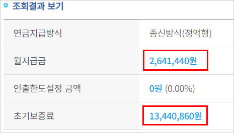 월지급금은 부부 중 나이가 적은 분을 기준으로 산정됩니다. 또한 앞에서 언급했듯이 계산 결과에서 보여지는 연금금액과 실제 월지급금 및 인출한도 금액은 가입시점 등에 따라 달라질 수 있습니다. 이점은 참고하셔야 합니다.