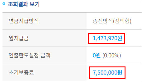 동일한 조건으로 4억 주택연금 예상연금 계산을 해보면 약 1,179,140원을 월 지급금으로 수령할 수 있는 것으로 나왔습니다. 초기보증료는 6,000,000원 입니다. 5억 주택연금 수령액 조회 결과는 월지급금이 1,473,920이 되는 것을 확인할 수 있습니다. 초기보증료는 7,500,000원입니다.