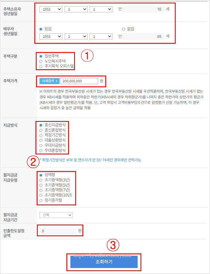 먼저 주택소유자와 배우자 생년월일은 입력합니다. 임의로 70세와 배우자는 69세를 입력해 보았습니다. 주택구분은 일반주택을 선택한 후 지급방식은 종신지급방식, 월지급금 지급유형은 정액형을 선택했습니다. 인출한도설정 금액은 종신지급방식 및 우대지급방식을 제외한 지급방식에서 선택이 가능합니다.