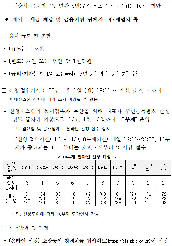 중기부에 따르면 지난해 12월15일 이전 개업한 소상공인과 소기업 중 △21년 12월18일 이후 영업시간 제한 △버팀목플러스 및 희망회복자금 지급 △2019년 또는 2020년 동기대비 2021년 11월 또는 12월 매출 감소 등의 조건에 해당돼야 한다고 합니다.