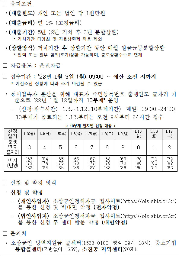 소상공인 초저금리 특별대출 희망대출 신청 방법에 있어 특히 동시접속 분산을 위해 3일부터 12일까지 신청 첫 열흘간은 대표자 주민등록번호상 출생연도 끝자리를 기준으로 10부제가 실시된다고 합니다. 출생연도 끝자리가 3인 경우 3일, 8인 경우 8일에, 9인 경우 9일에 신청할 수 있다고 합니다. 이어 오는 1월13일부터는 출생연도 끝자리와 관계없이 신청이 가능하다고 합니다.