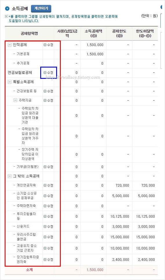 먼저 소득공제 항목이 안내되는데요. 이 부분에서 추가하거나 수정할 부분이 있으면 수정해 금액을 기입하면 된다고 합니다.