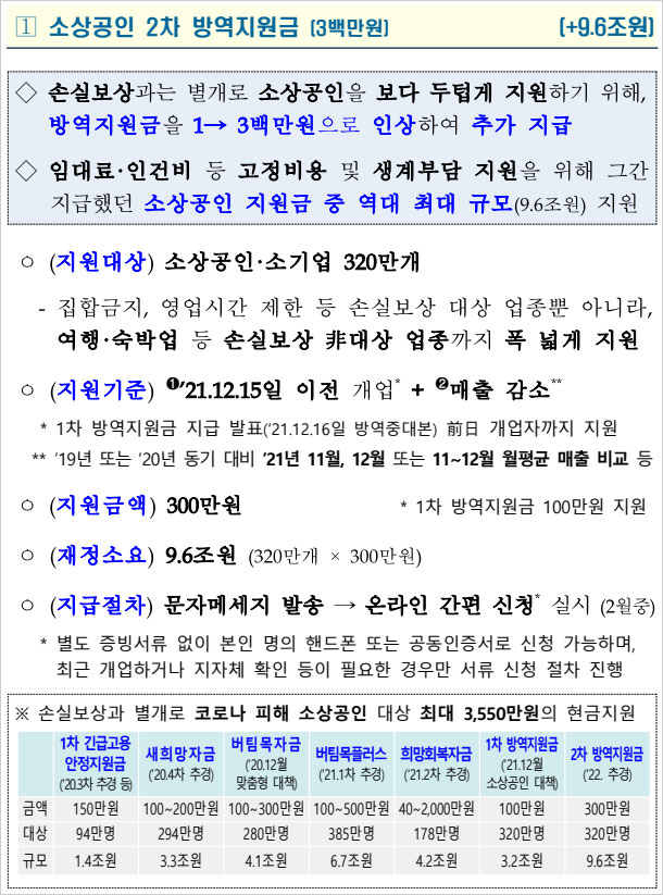 2차 방역지원금인 방역지원금 소상공인 300만원 추가지원시기 대상은 1차 방역지원금 지급 발표 전날인 지난해 12월 15일 이전에 개업해 매출 감소를 겪은 320만 개 소상공인 및 소기업체라고 합니다. 집합금지 및 영업시간 제한 등 손실보상 대상 업종 뿐 아니라 여행 및 숙박업 등 손실보상 비대상 업종까지 지원한다고 합니다.