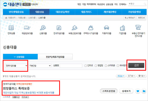 우리은행 홈페이지에서 금융상품을 클릭하고 대출항목에서 신용대출 세부항목에서 정책자금 대출을 선택 한 후 검색을 클릭하면 중신용자를 위한 우리은행 희망플러스 특례보증 대출 상품에 대해 확인 할 수 있습니다.