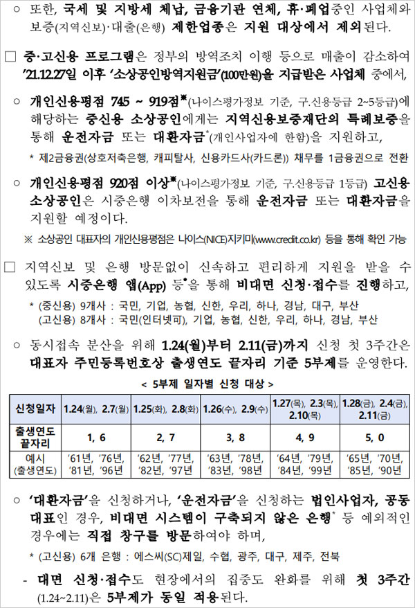 다만 저신용 및 중신용, 고신용 프로그램 중 1가지만 신청이 가능하고 지난해 11월29일 시작된 소진공의 '일상회복특별융자를 지원받았으면 신청할 수 없다고 합니다.