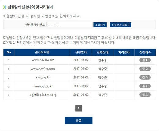 웹사이트 회원탈퇴 신청 시 등록한 임시 신청인 확인번호를 입력하시면 현재 접수 및 처리 진행중이거나, 회원탈퇴 처리완료 후 30일 이내 내역을 확인할 수 있다고 해요.