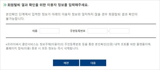 e프라이버시 클린서비스에서는 개인정보 도용으로 인한 피해를 예방하기 위해 정보주체(이용자) 본인 확인을 위한 절차를 강화하였는데요. 이용자 정보와 <STEP 1> 본인확인 단계에서 입력한 정보가 일치하는 경우에만 회원탈퇴 결과 확인 등의 서비스를 이용할 수 있다고 해요.