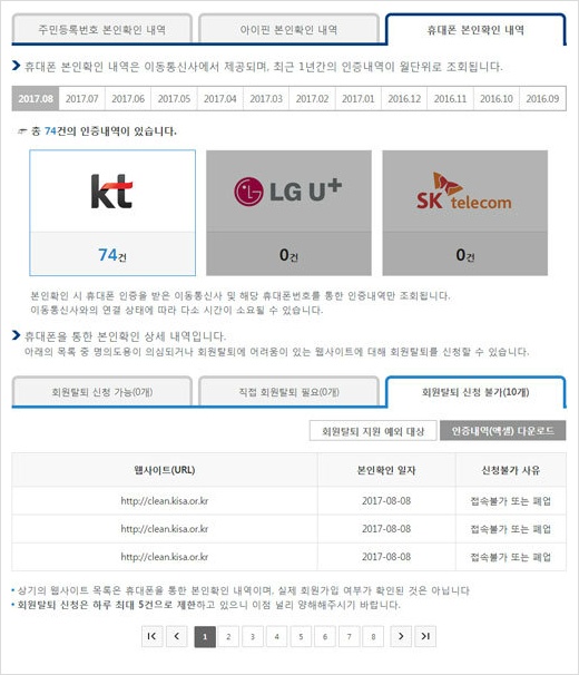 홈페이지에서는 SKT, KT, LG U+ 등 이동통신 3사뿐 아니라 알뜰폰(MVNO) 및 사용자 등록이 완료된 법인폰도 본인확인 내역을 확인할 수 있기 때문이예요. 또한 불필요하거나 도용되었다고 의심되는 웹사이트에 대한 회원 탈퇴를 요청하면 한국인터넷진흥원에서 일괄적으로 탈퇴 처리를 대행해 주기도 하니까 더 이용해 볼만 하겠죠.