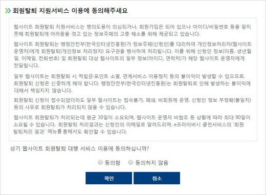 웹사이트 회원탈퇴 지원서비스 이용에 동의해주세요.