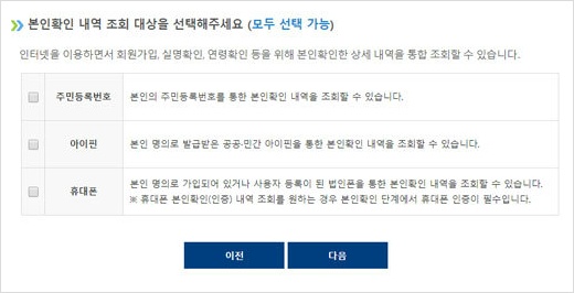 본인 명의로 발급, 가입된 아이핀 및 휴대폰, 공인인증서 가운데 하나를 선택하여 본인확인을 해야 하는데요. 단, 스마트폰 등 모바일기기에서는 공인인증서 본인확인이 제공되지 않으며, 휴대폰 본인확인 내역을 조회할 경우에는 휴대폰 인증이 필수라고 해요.
