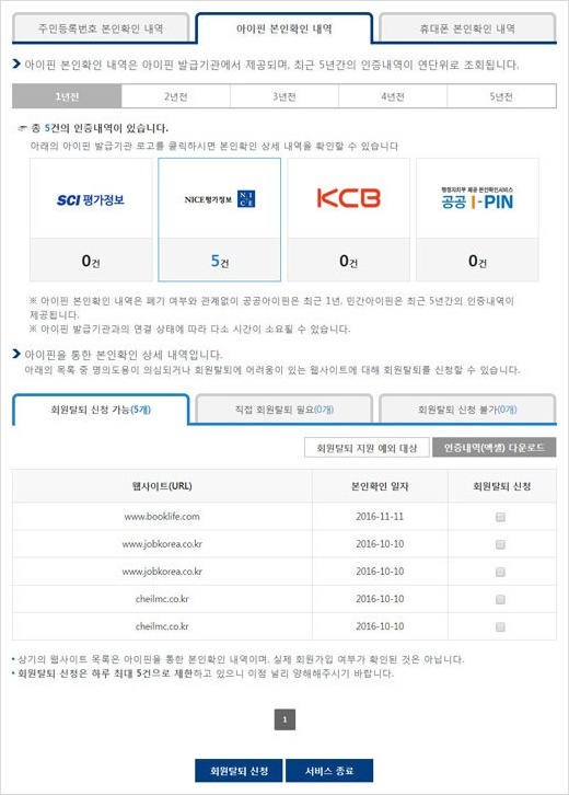 아이핀 본인확인 내역 조회 결과 예시구요.