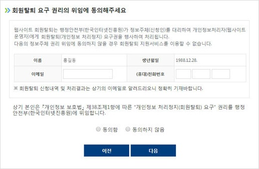 웹사이트 회원탈퇴 요구 권리의 위임에 동의해주세요.