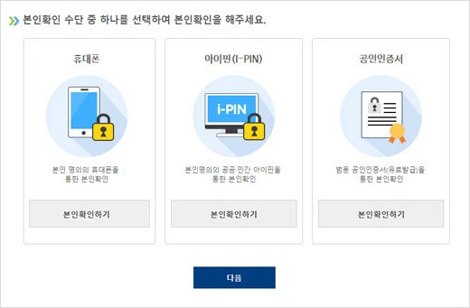 본인확인 수단 중 하나를 선택하여 본인확인을 해주세요.