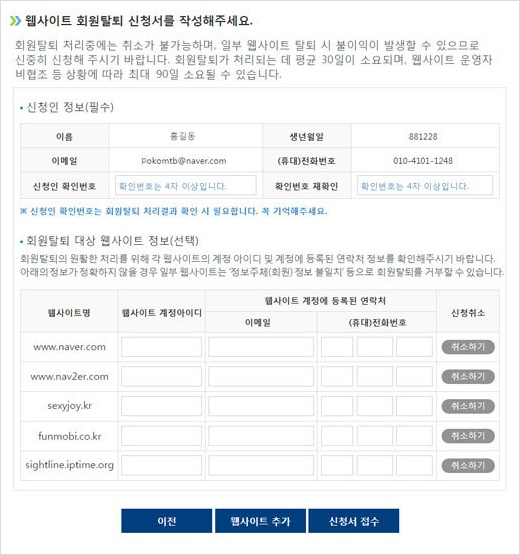 웹사이트 회원탈퇴의 원활한 처리를 위해 신청인의 기본정보(필수사항) 및 회원탈퇴 대상 웹사이트 정보(선택사항)를 기재해주면 되요.