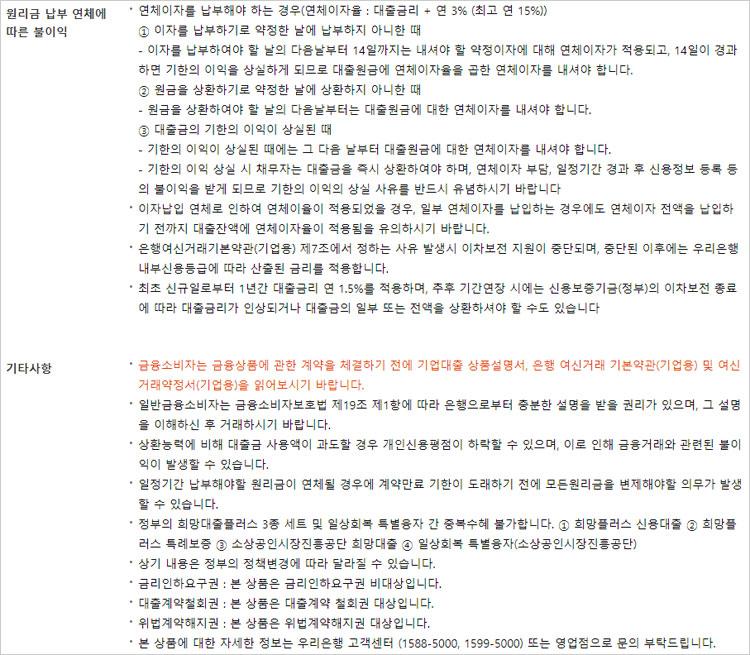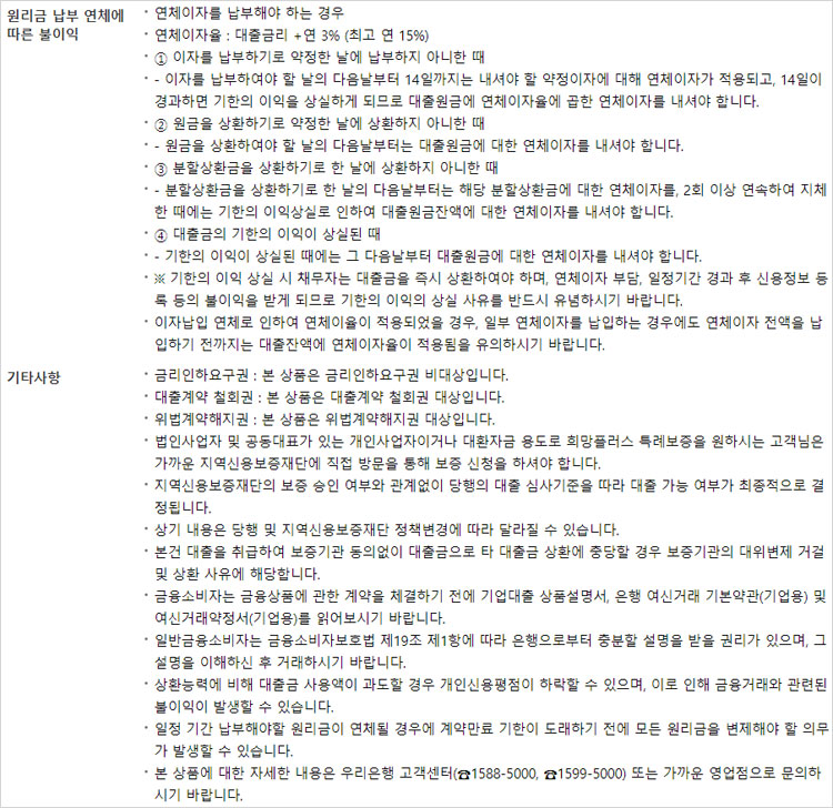 - 연체이자율 : 적용금리 + 연 3% (최고 연 15%)