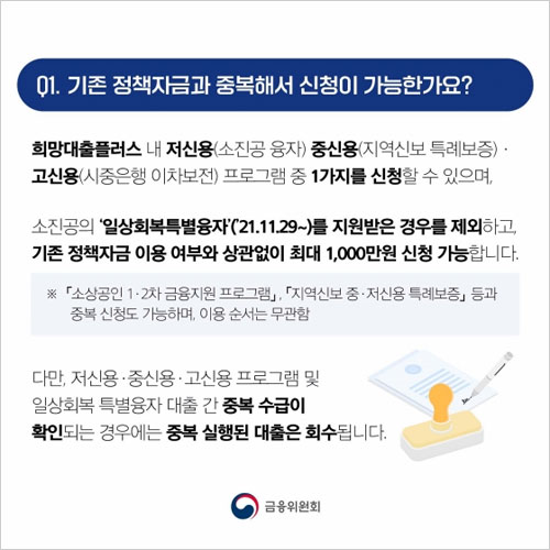 - 정부의 희망대출플러스 3종 세트 및 일상회복 특별융자 간 중복수혜 불가합니다. ① 희망플러스 신용대출 ② 희망플러스 특례보증 ③ 소상공인시장진흥공단 희망대출 ④ 일상회복 특별융자(소상공인시장진흥공단) 등