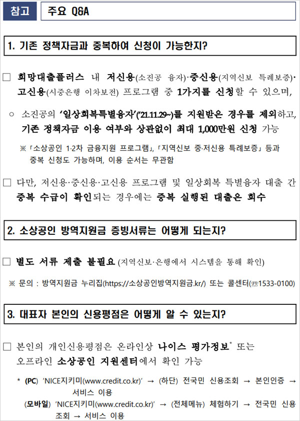 방역지원금 및 소상공인 희망대출플러스 대상 중 개인 신용평점 745~919점(나이스평가정보 기준, 옛 신용등급 2~5등급)의 중신용 소상공인에게는 지역신보의 희망플러스 특례보증 대출을 통해 운전자금 및 대환자금이 지원된다고 합니다.