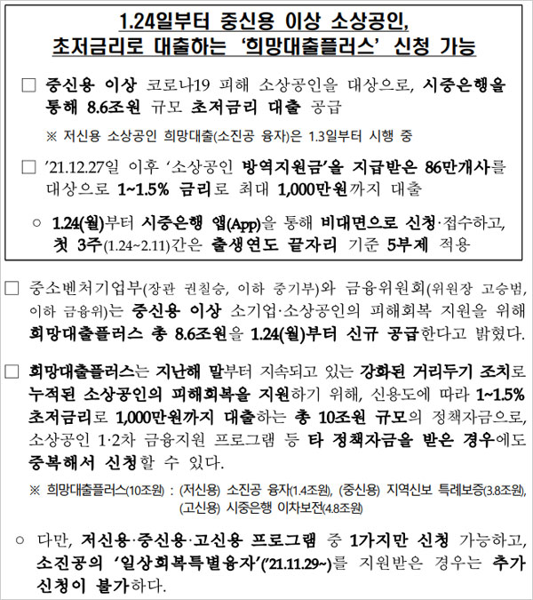 지난 1월 24일부터 신청을 받고 있는 방역지원금 및 소상공인 희망대출플러스는 중신용자 대상의 지역신용보증재단 특례보증과 고신용자 대상의 시중은행 이차보전으로 진행된다고 합니다.