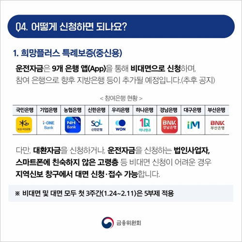 희망플러스 특례보증 대상인 중신용자는 국민은행, 기업은행, 농협은행, 신한은행, 우리은행, 하나은행, 경남은행, 대구은행, 부산은행 등 9개 은행을 통해 운전자금 신청이 가능합니다. 참여 은행으로 향후 지방은행 등이 추가될 예정이라고 합니다.