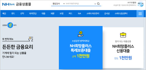 농협은행 홈페이지에서 금융상품몰을 클릭하고 농협은행을 클릭하면 홈페이지에서 중신용자를 위한 농협 소상공인 희망대출플러스 NH희망플러스 특례보증대출 상품과 고신용자를 위한 농협 소상공인 희망대출플러스 NH희망플러스 신용대출 상품을 확인 할 수 있다고 합니다.
